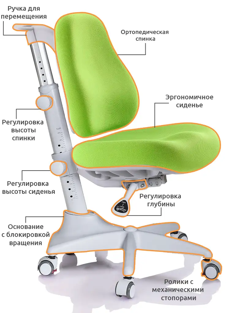 " Незалежне регулювання спинки та сидіння. Висота крісла регулюється в діапазоні 36-58 см. Також регулюється глибина сидіння в діапазоні 30-45 см. Завдяки такому широкому діапазону регулювання, крісло відмінно підходить і учню початкової школи, і старшокласнику.