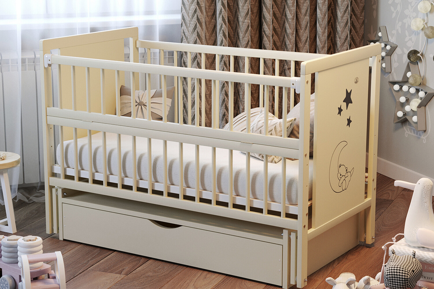Дитяче ліжечко «Ведмедик» кольору Слонова Кістка - це елегантне та функціональне рішення для комфортного та безпечного сну вашого малюка. Виготовлене з натурального дерева бук, це ліжечко забезпечує довговічність і надійність. Покрите лаком на водній основі від провідних європейських виробників, ліжечко не викликає алергії і абсолютно безпечне для дитини.