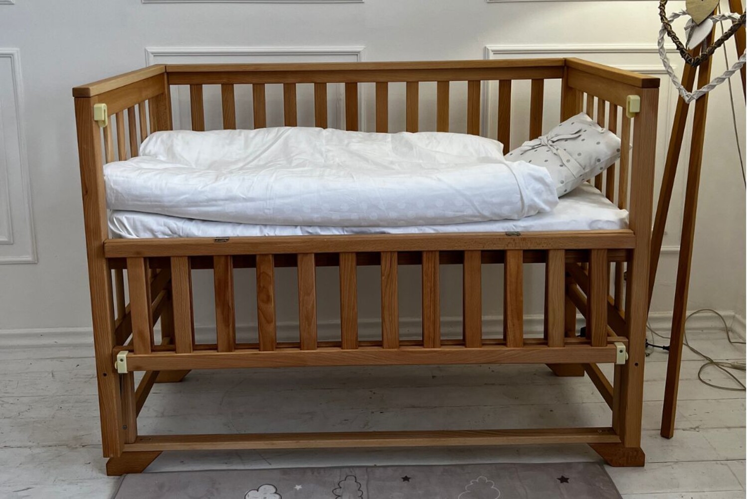 - Відкидна боковина: Полегшує доступ до немовляти і служить захисним бар'єром, фіксується за допомогою пластмасових фіксаторів.