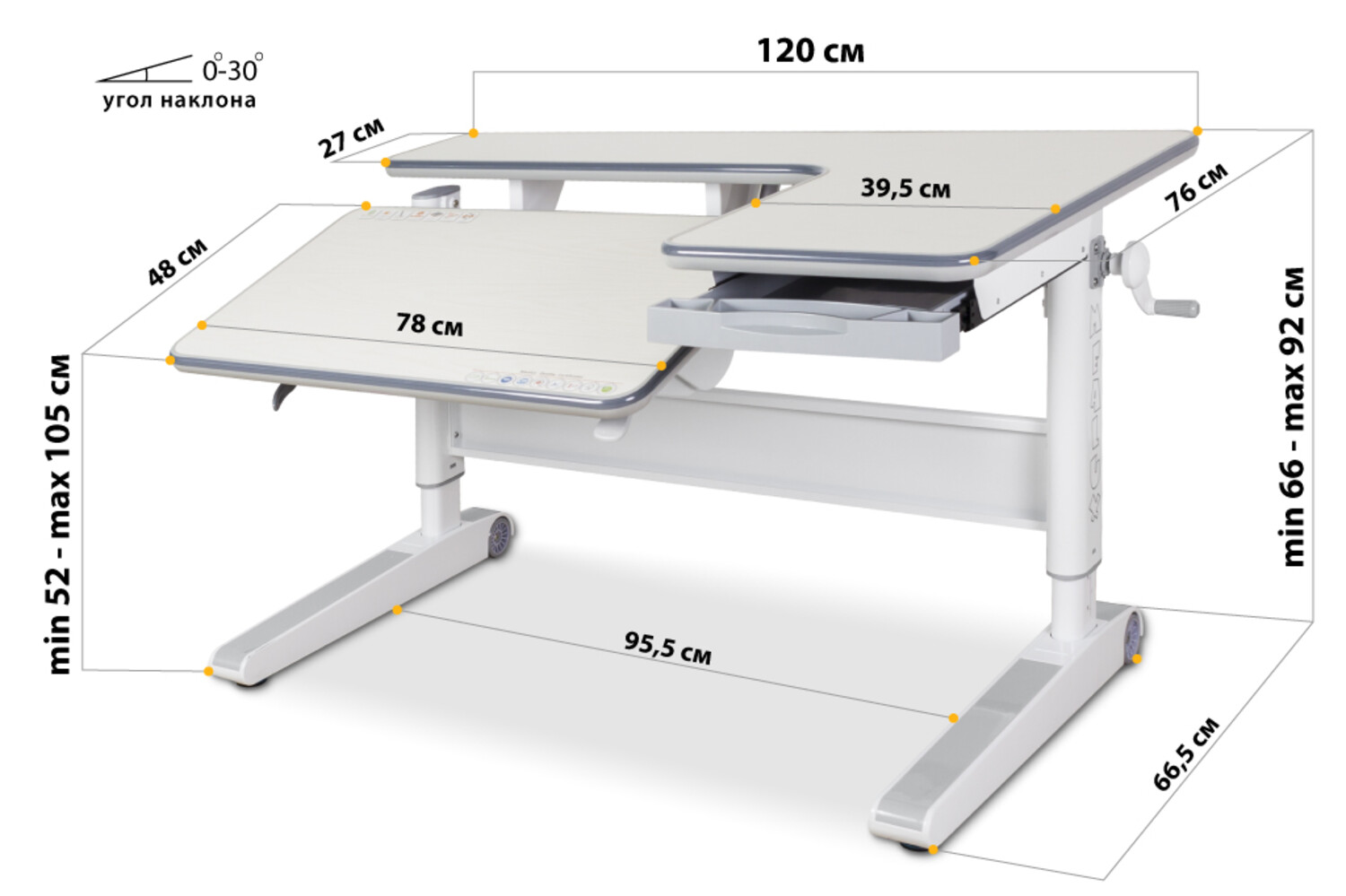 Рухлива частина стільниці регулюється по висоті незалежно від столу. Для зміни висоти рухомої частини під стільницею розташована невелика ручка, при натисканні якої стільниця плавно опускається чи піднімається.