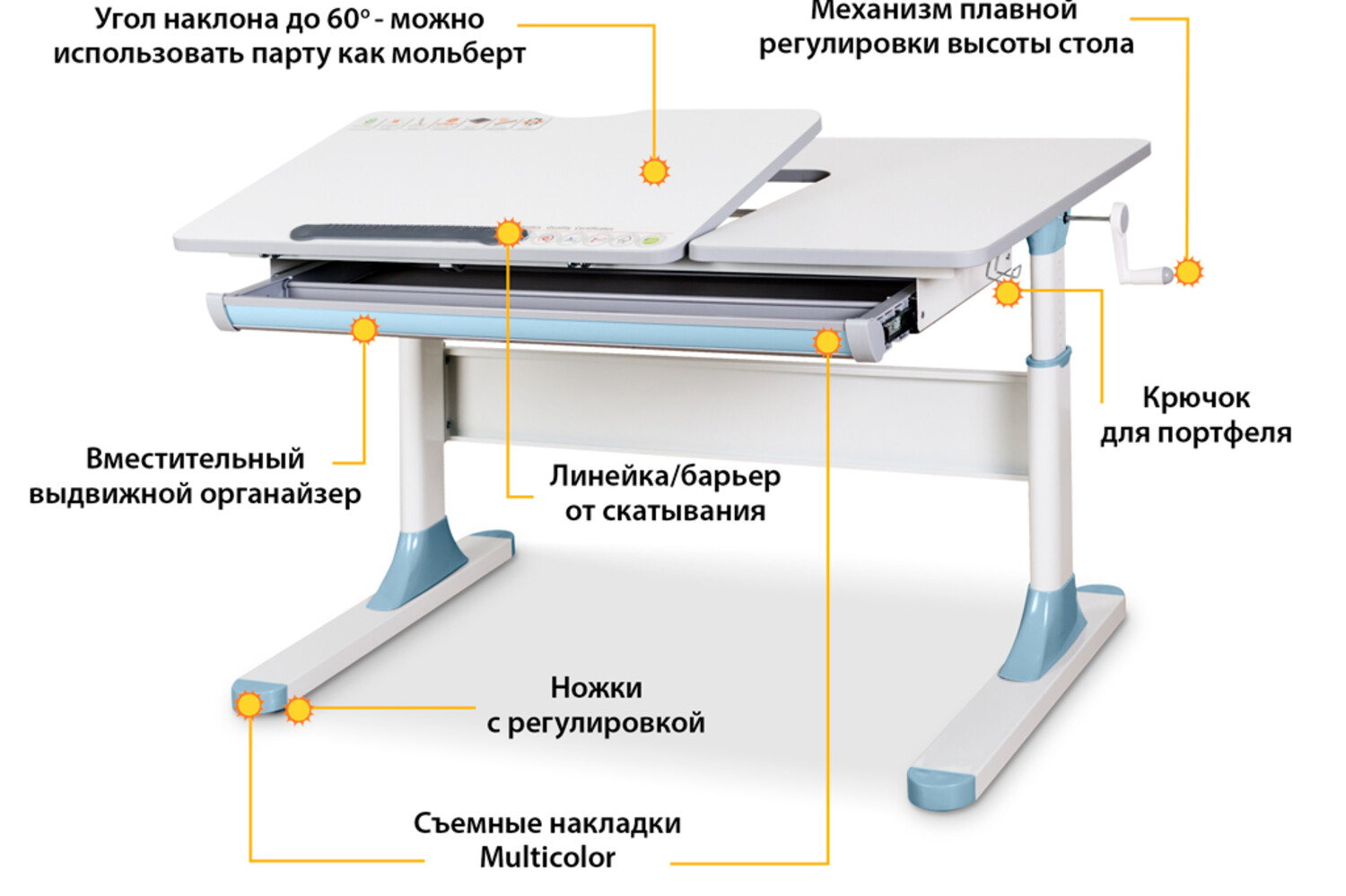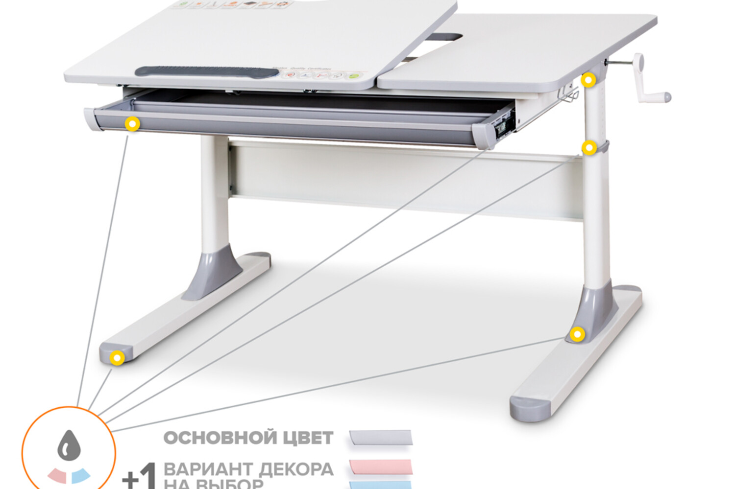 з надбудовою, з гачком для портфелю, ніжки з регулюванням, ручка регулювання, кольорові накладки