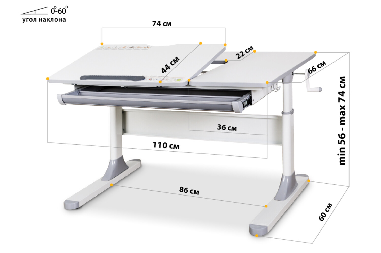 Кут нахилу стільниці: за допомогою газліфта стільниця регулюється до 60 градусів для письма, читання або малювання.