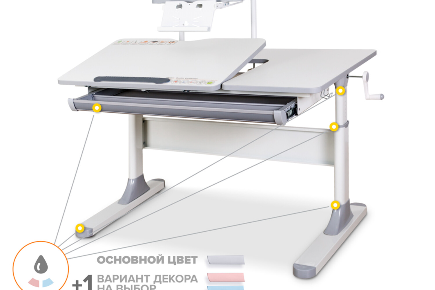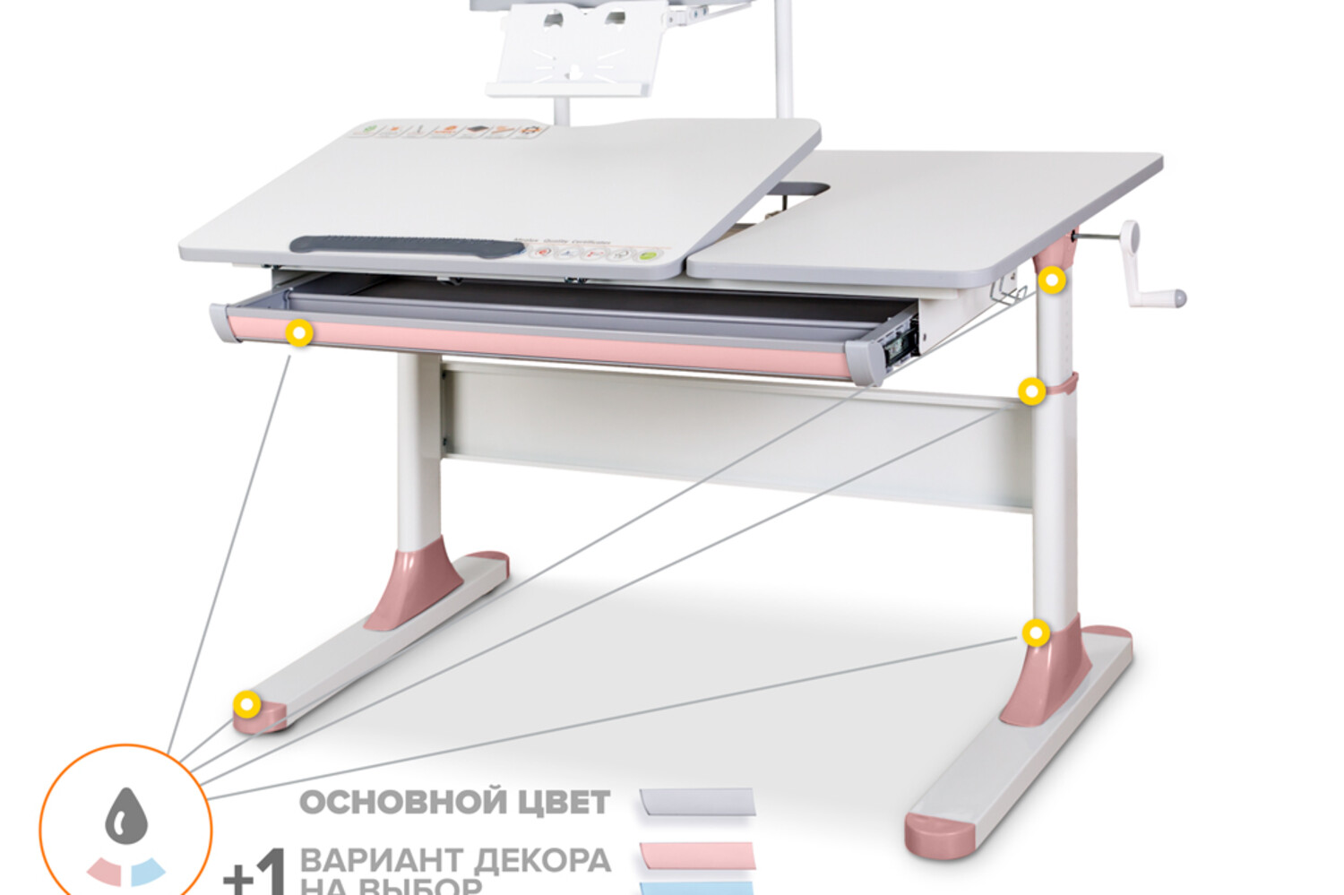 Важливою особливістю даного столу є змінні кольорові накладки. Купуйте повну комплектацію столу в сірому кольорі і отримайте рожеві або блакитні накладки безкоштовно! Накладки змінюються на ніжках та висувному органайзері. Змінюйте колір залежно від настрою!