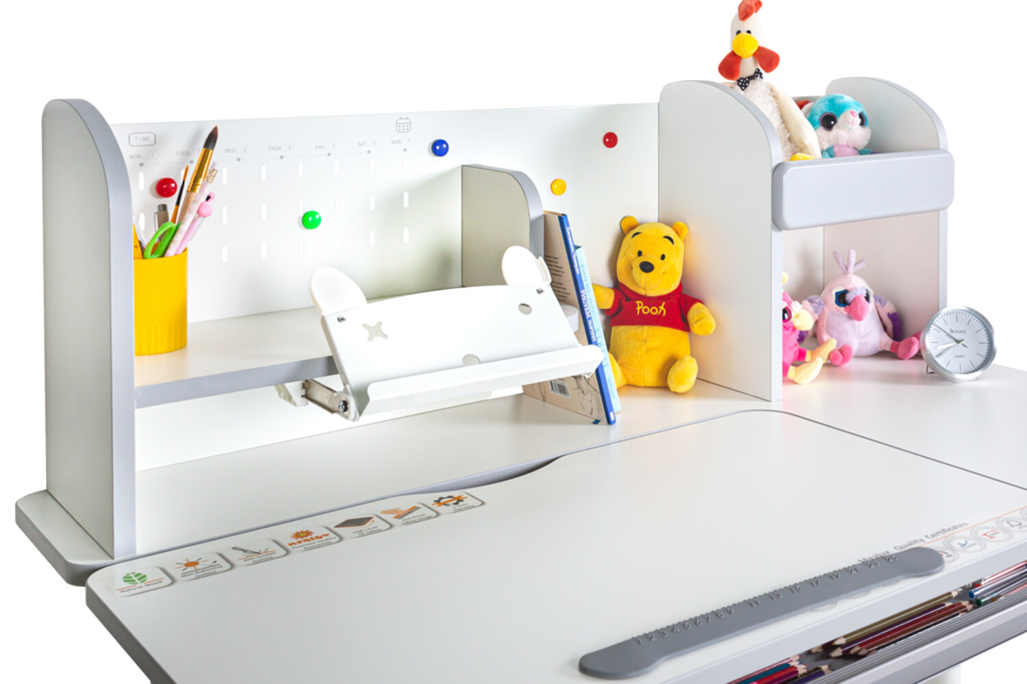 з полицею-надбудовою, висувна підставка для книг, з гачком для портфеля, ручка регулювання, пенал, ніжки з регулюванням, металева стінка для магнітів