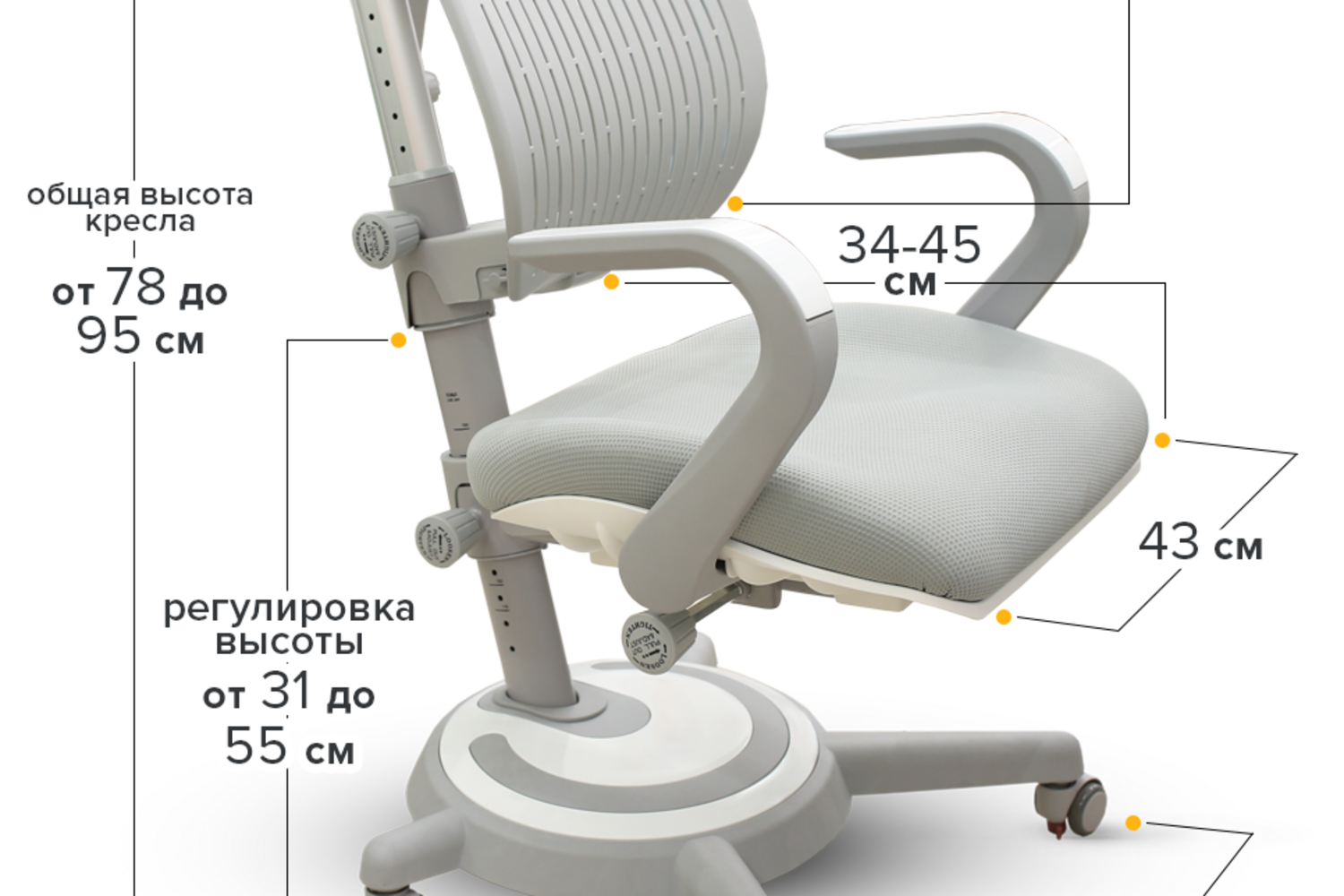 Створюючи ергономічний і стильний навчальний простір для дитини, слід приділити особливу увагу кріслу, оскільки від грамотно обраного крісла залежить подальший комфорт і здоров'я дитини. Спинка крісла має унікальну конструкцію, тому буде максимальне прилягання до спини дитини і, як результат, чудовий поперековий упор, підтримка спини та мінімізація навантаження на хребет, а також формування правильної постави. Крісло також доповнено підлокітниками. Сидіння крісла має ергономічну форму і плавно повторює контури тіла, коли дитина сидить, забезпечуючи нормальну циркуляцію крові.