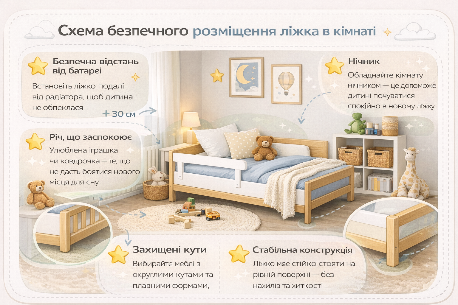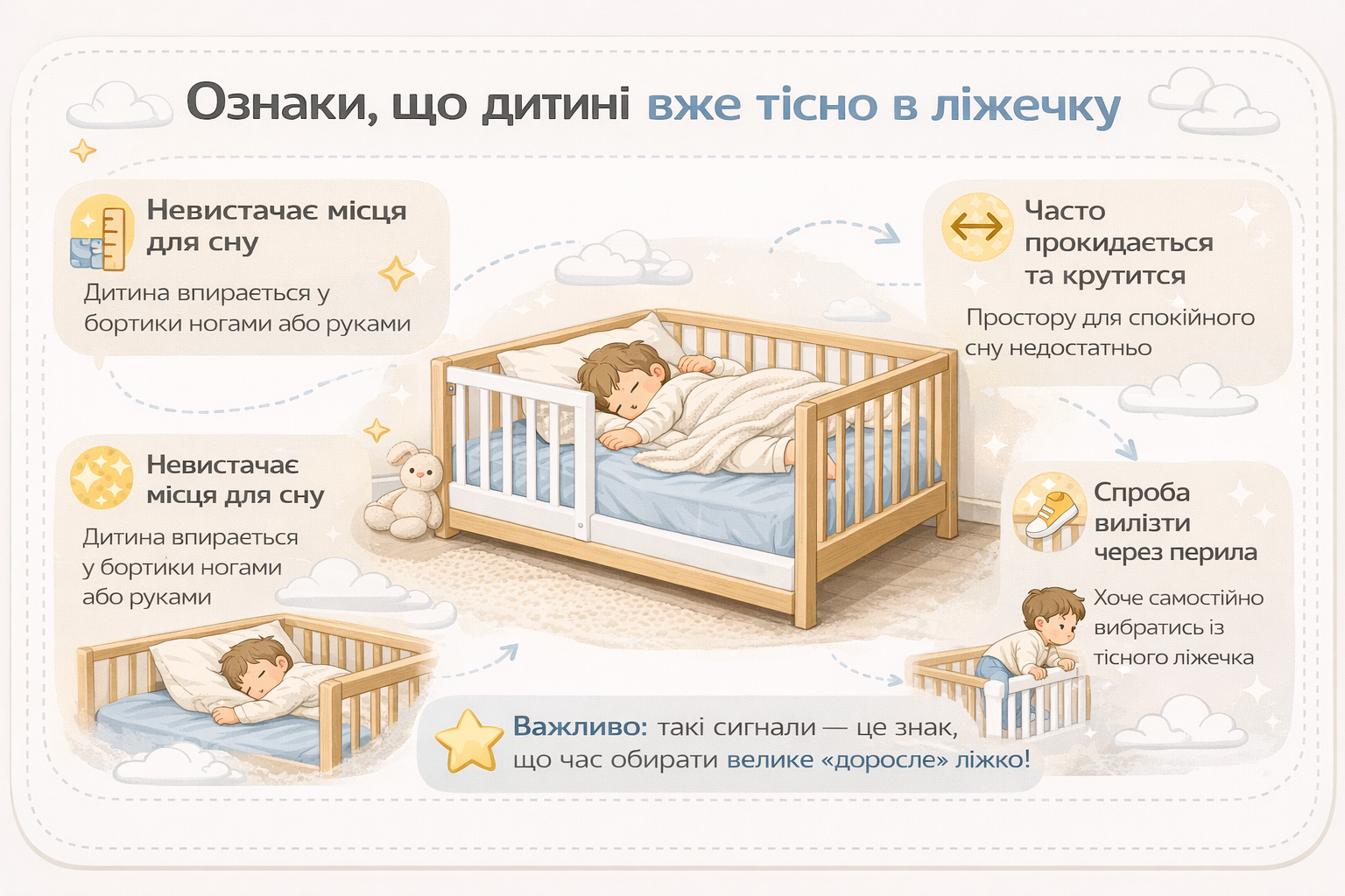 Якщо малюк намагається вилізти через перила, перехід до великого ліжка стає не просто логічним, а необхідним. У такому випадку головне завдання батьків — якнайшвидше обрати безпечну модель з невисокою основою та захисними бортиками.
