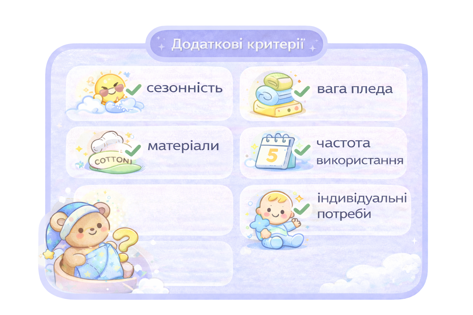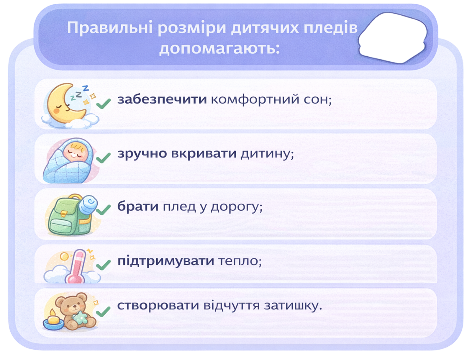 Плед супроводжує дитину щодня — вдома, у ліжечку, на прогулянках. Коли розмір дитячого пледа обраний правильно, він не сповзає, добре зігріває та створює відчуття безпеки.