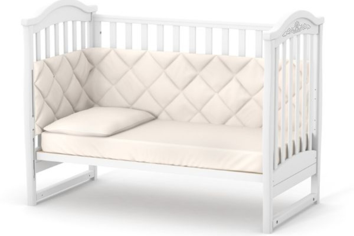 - без системы укачивания, устанавливается на ножки (систему укачивания – маятник либо маятник с ящиком, колёса – можно докупить отдельно, маятник и колеса с фиксаторами);