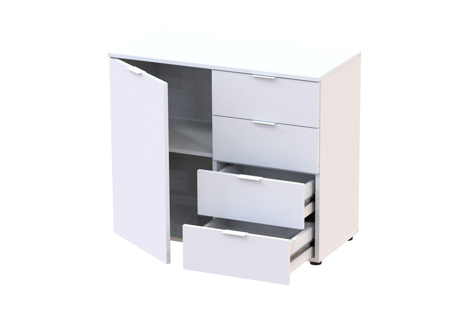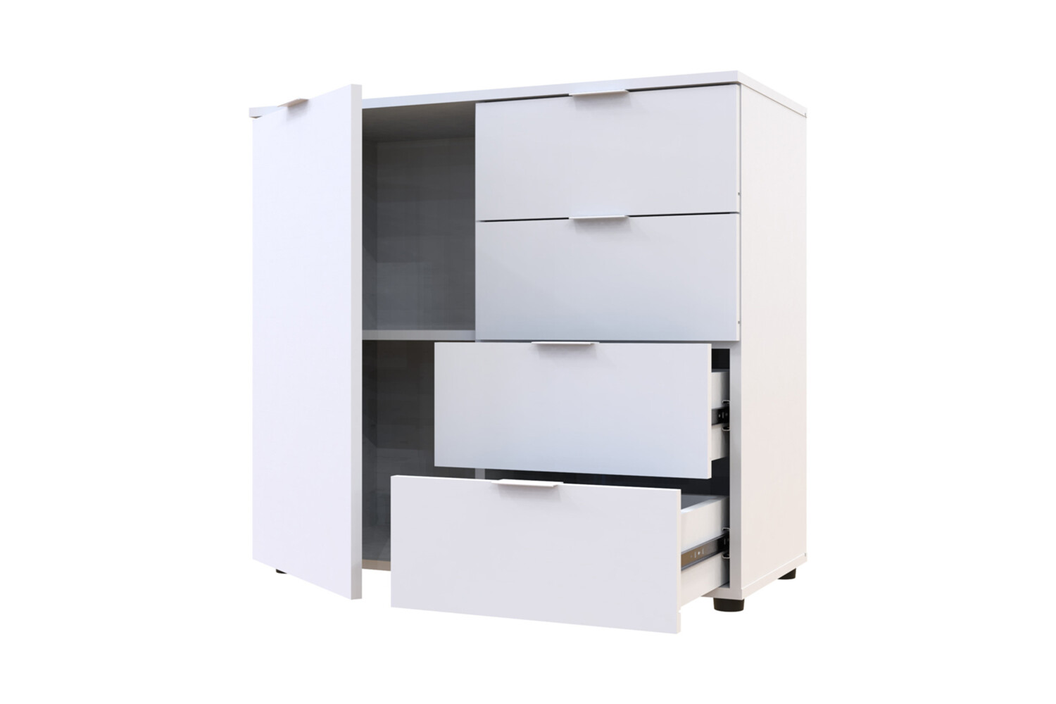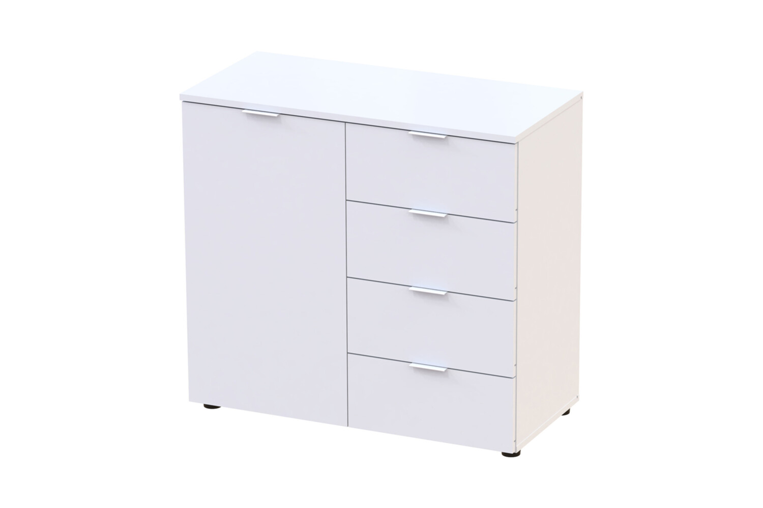 Комод Рон 1 з одним фасадом і чотирма шухлядами в білому кольорі поєднує в собі елегантний дизайн і практичність, забезпечуючи зручне зберігання речей.