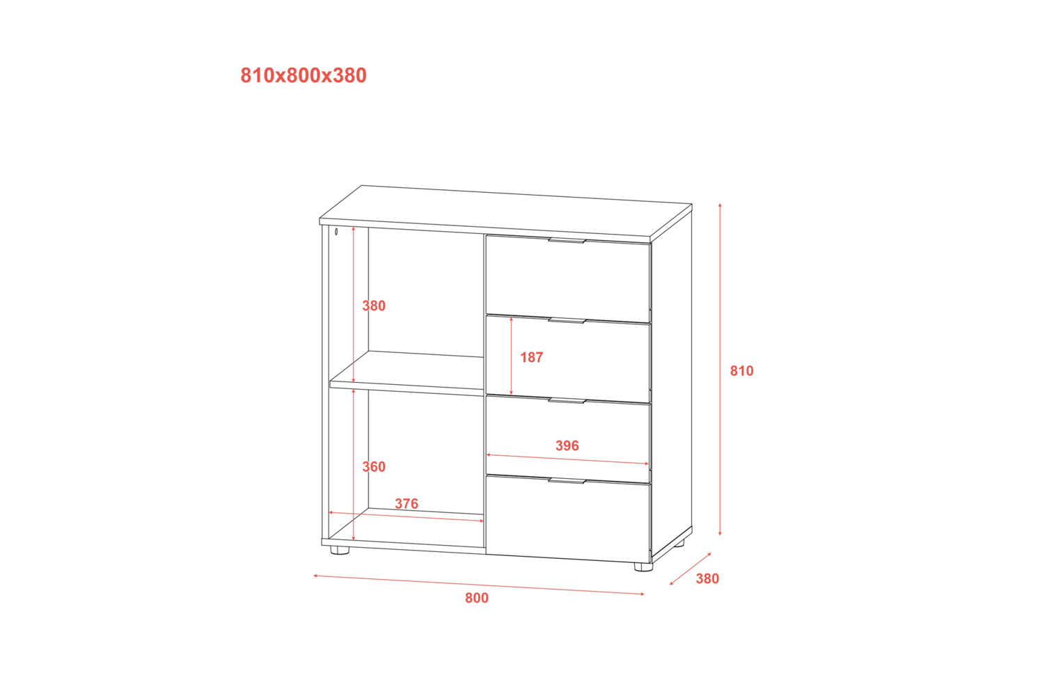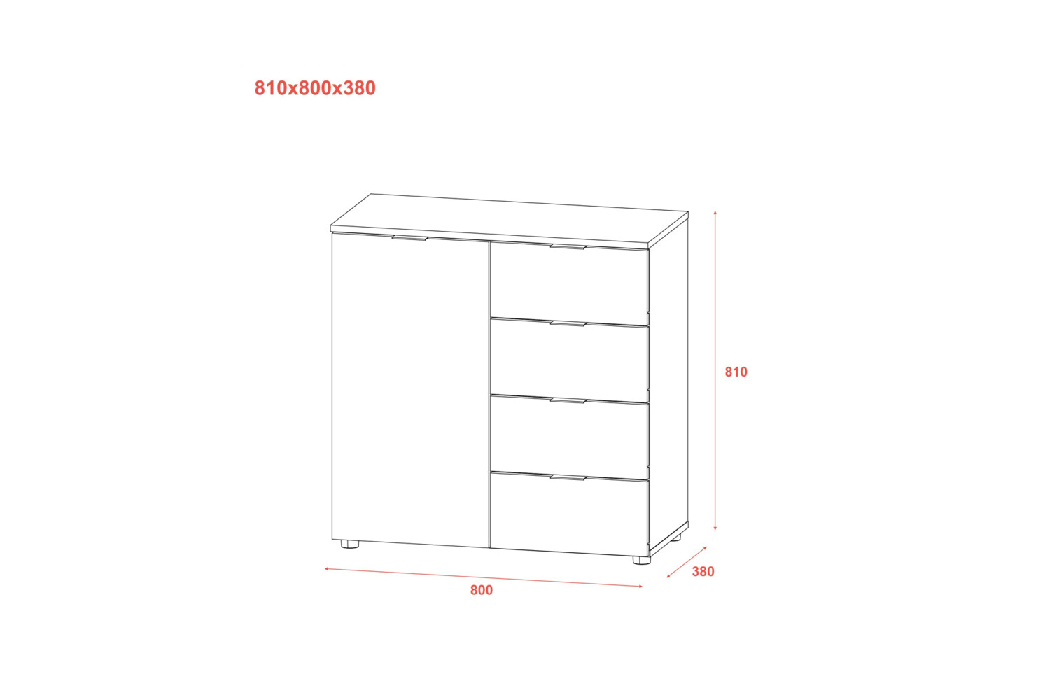 Багатофункціональність: Комод оснащений чотирма висувними шухлядами й одним фасадом із дверцятами, що забезпечує достатньо місця для зберігання різних предметів і одягу.