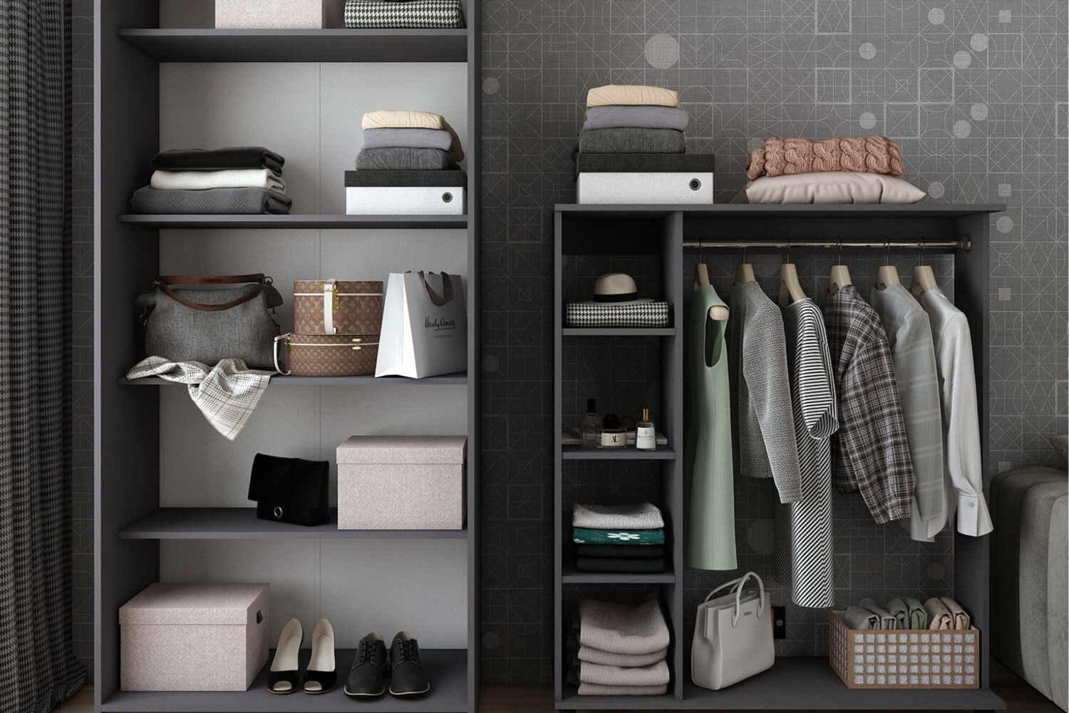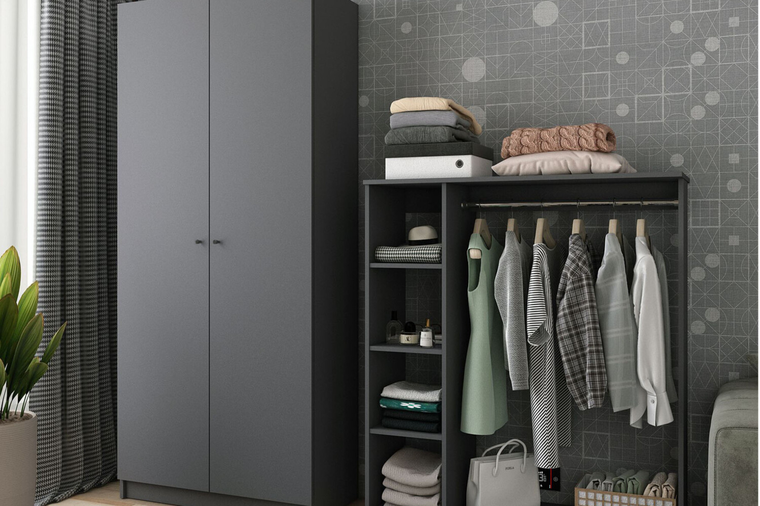 Шафа для одягу Promo з полицями Графіт 2 ДСП ця шафа забезпечує не тільки зручне зберігання одягу, а й надає інтер'єру вашої дитячої елегантного вигляду.