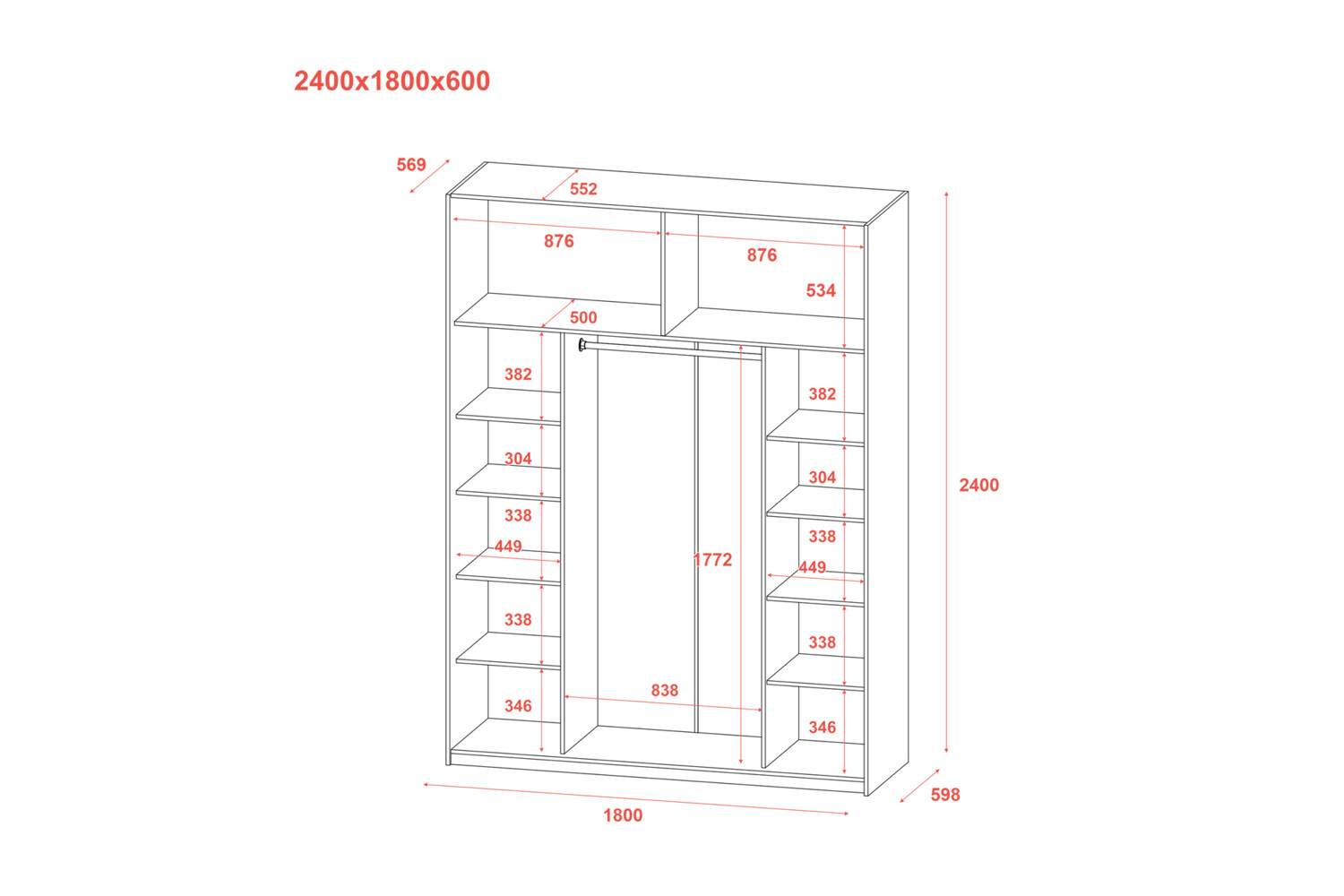 Практичність і функціональність: У шафі-купе передбачено 12 полиць для білизни й одна штанга для одягу, що дає змогу ефективно організувати простір для зберігання різних речей.