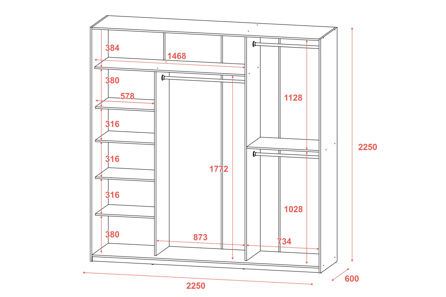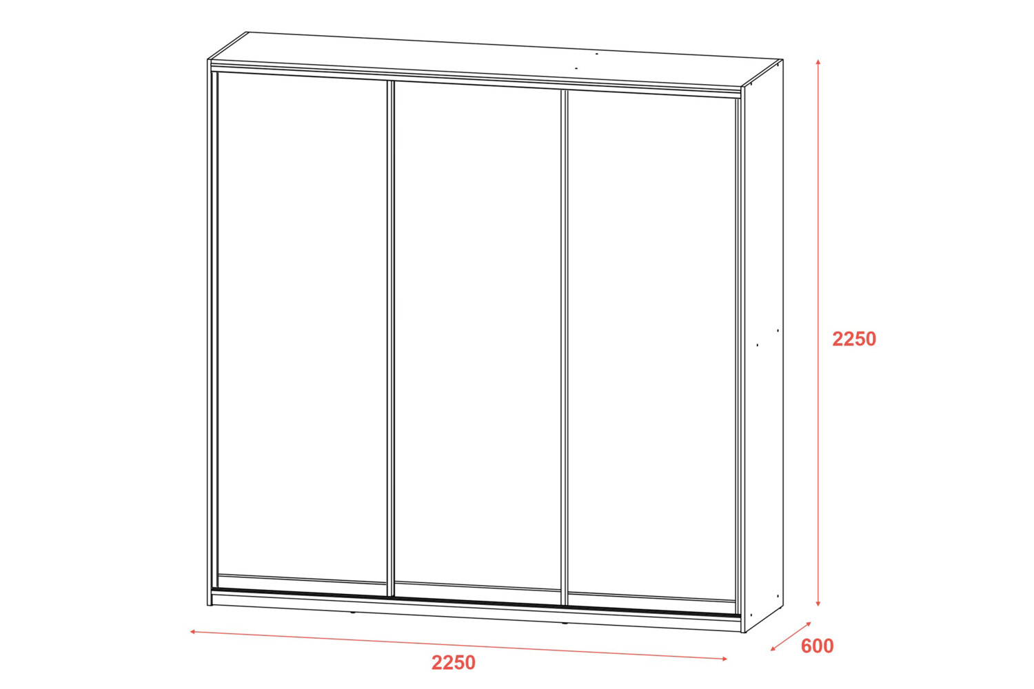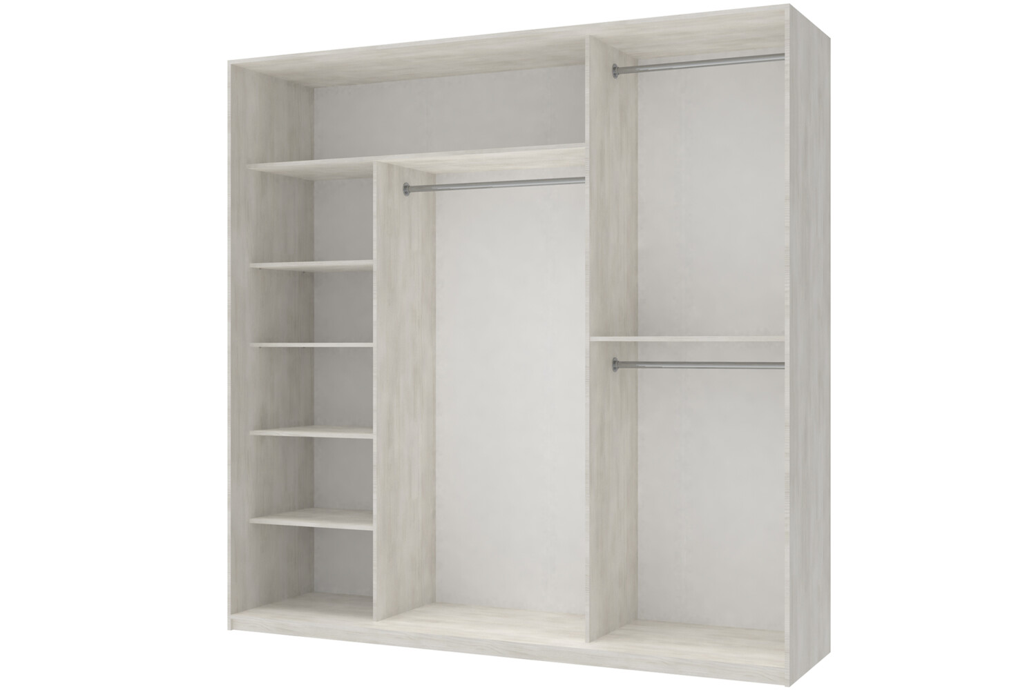 Практичні можливості: Шафа оснащена 3 розсувними дверима. Також у шафі передбачено 6 полиць для білизни та 3 штанги для одягу, забезпечуючи максимальну зручність та організацію зберігання.