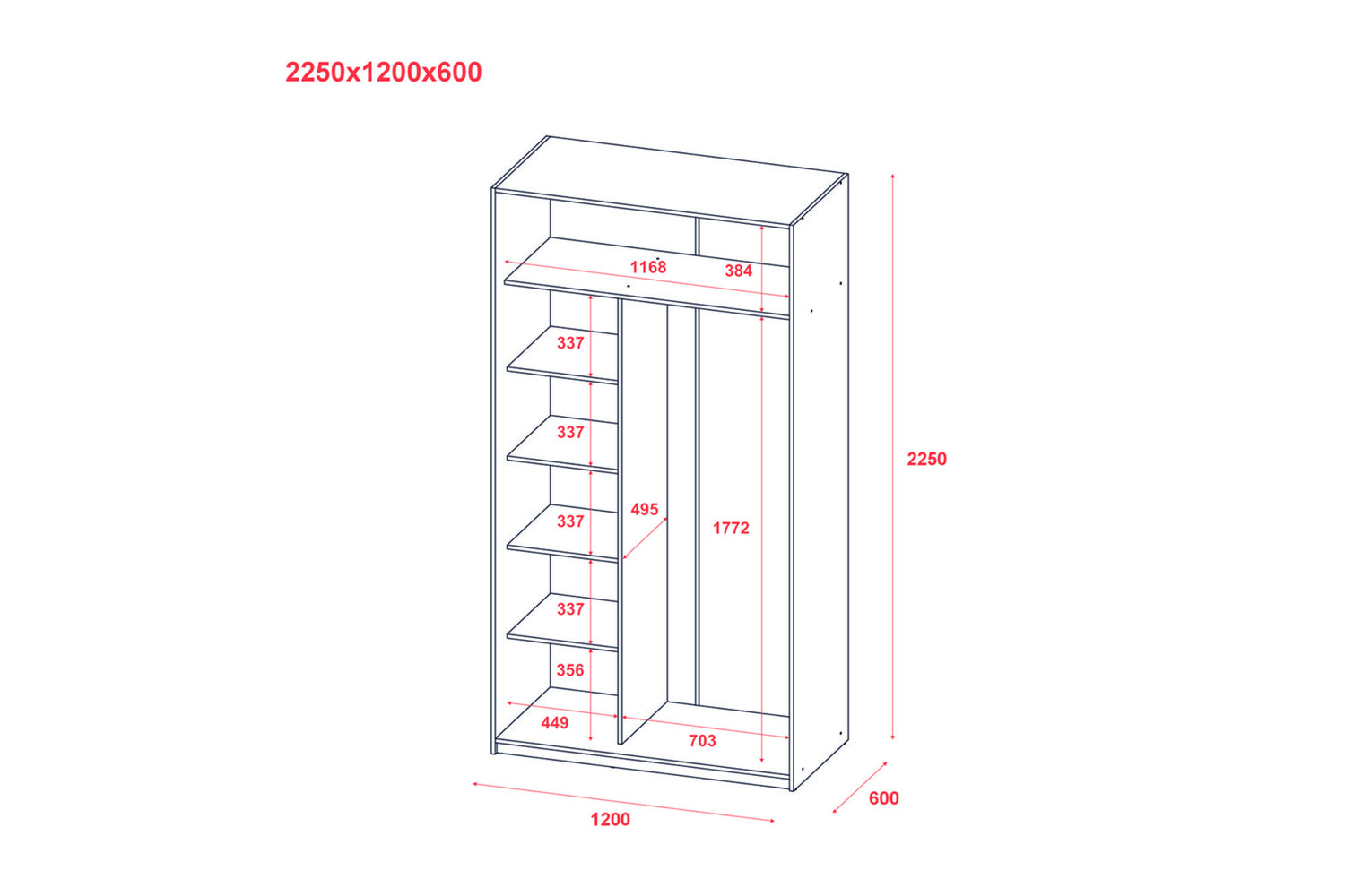 Практичні можливості: Шафа оснащена 2 розсувними дверима. Також у шафі передбачено 6 полиць для білизни та 1 штанга для одягу, забезпечуючи максимальну зручність та організацію зберігання.
