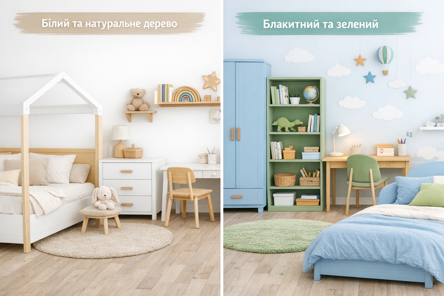 Блакитний часто пов’язують із відчуттям спокою та врівноваженості. Зелений вважають кольором гармонії, концентрації та м’якого відновлення. Саме тому такі відтінки доречні в кімнаті, де дитина не лише грається, а й навчається.