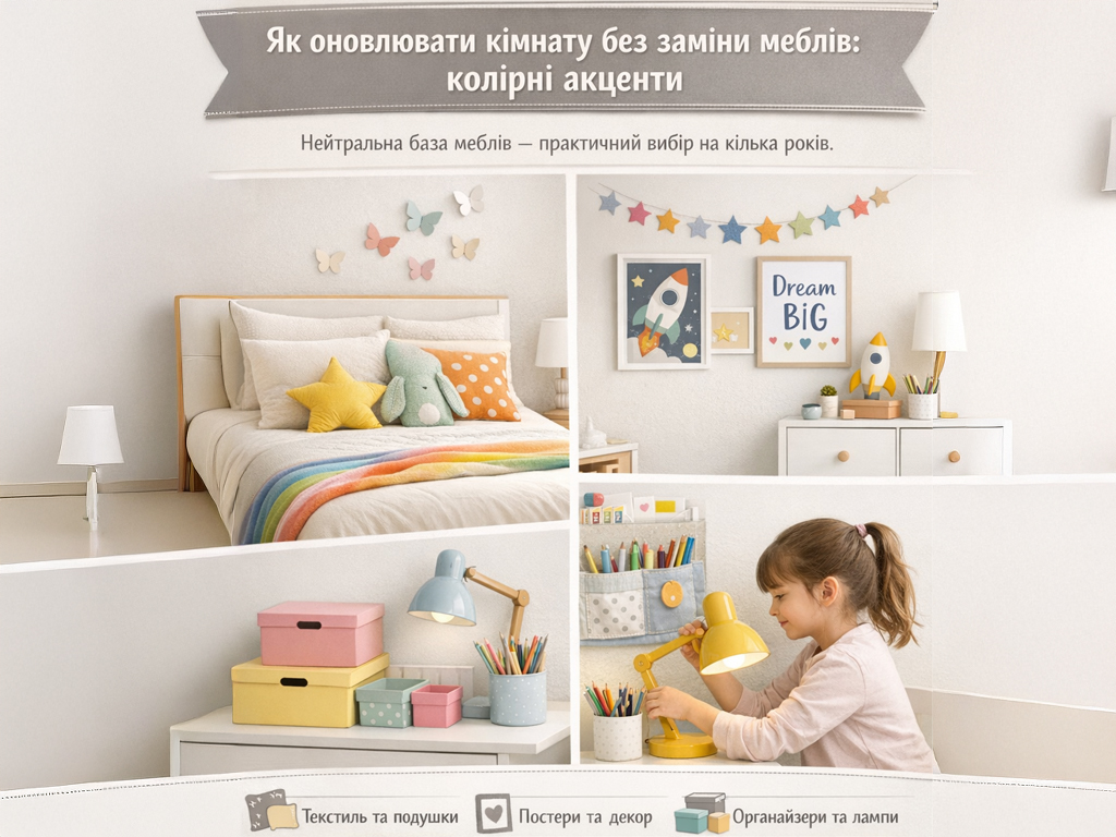 Нейтральна база меблів — практичний вибір на кілька років. Дитячі смаки змінюються доволі швидко, тому значно зручніше залишити основні меблі в спокійному кольорі, а настрій кімнати змінювати за допомогою акцентів.