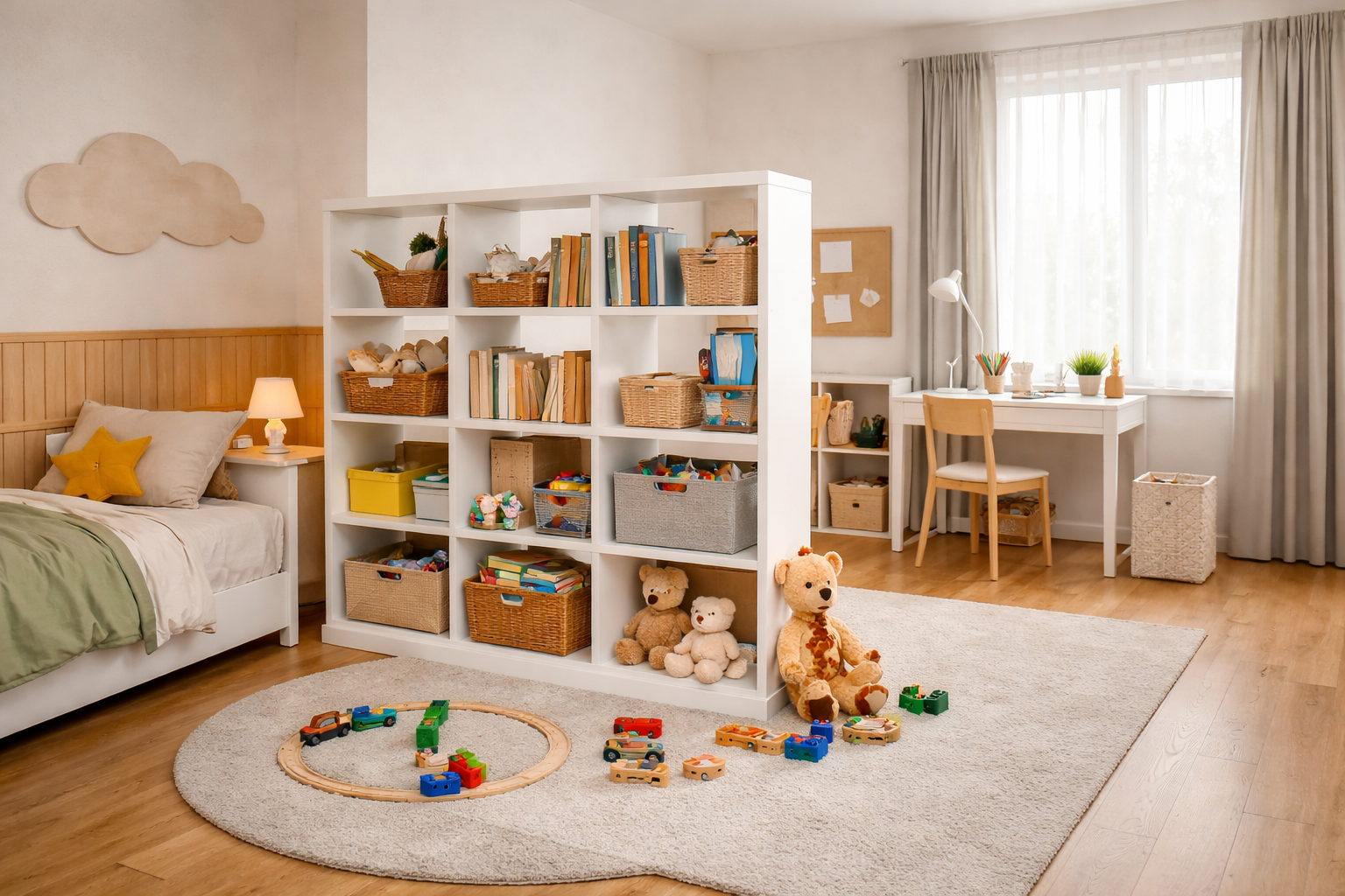 Місце для гри має залишатися відкритим, безпечним і адаптивним. У цій частині кімнати важливо не перевантажувати простір важкими предметами, щоб дитина могла легко рухатися, змінювати сценарії гри та швидко прибирати речі після активностей.